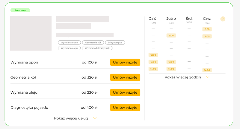 Zamiast ogólnego profilu, pokazujesz konkretną, zróżnicowaną ofertę, która zwiększa szansę na to, że klient znajdzie dokładnie to, czego potrzebuje – bez konieczności dzwonienia i dopytywania. Krótko mówiąc: odpowiadasz na potrzeby, zanim klient zada pytanie. Precyzyjne dopasowanie usług to więcej trafionych rezerwacji, mniej rezygnacji i większe zyski. Klienci częściej wybierają warsztat, który daje im jasność, pełen zakres usług i możliwość wygodnego umówienia się online – a Ty maksymalnie wykorzystujesz potencjał każdego kontaktu.